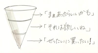 かといって、切実に求めてくれる下の細い部分を狙うと、市場ボリュームが小さい、つまりニッチすぎてお客様数が少なく、売上が立たなかったります。